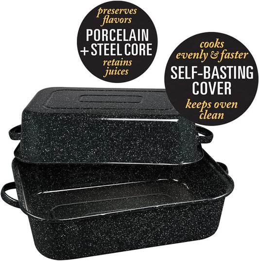 Granite Ware 25 lb. Capacity 19.5 in. Covered Rectangular Roaster, Speckled Black Enamel on Steel